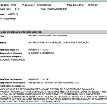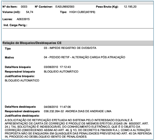 Conforme se verifica dos documentos constantes entre as fls. 96 a 106 e, ainda, entre as fls. 109 a 115 do presente processo administrativo, foram devidamente realizadas as retificações exigidas pela Receita Federal, notadamente por meio de solicitações de desbloqueio com o motivo “04 – PEDIDO DE RETIF – ALTERAÇÃO DA CARGA APÓS TRACAÇÃO” e “05 – PEDIDO RETIF – ALTERAÇÃO ITEM PÓS ATRACAÇÃO”, que indicam a alteração dos dados de conhecimento de carga previamente à atuação fiscal. Abaixo, imagem extraída da documentação referente a um dos itens efetivamente retificados: